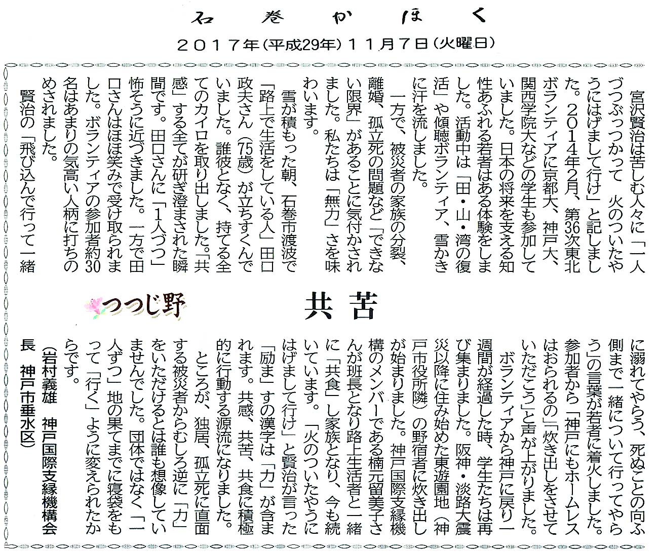 『石巻かほく』つつじ野⑦ (2017年11月7日付)
