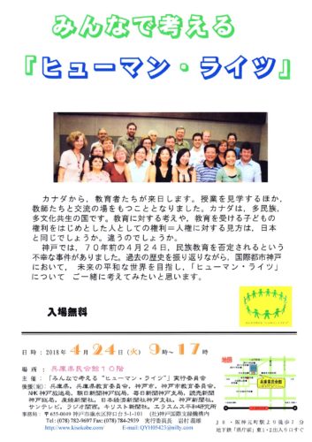 23日夜,カナダから教育関係者たちが来神。4月24日にシンポジウムを開催。兵庫県民会館10階で「人権」について多民族・多文化共生のモデルであるカナダから発題。日本側は北海道から旭川アイヌ協議会の 川村兼一会長(川村カ子トアイヌ記念館館長)。「先住民族」とは「異民族によって強制的に併合された集団 」のこと。琉球については平和活動家 安次富浩氏。日本人がいかにマイノリティー(少数者)を差別,抑圧,