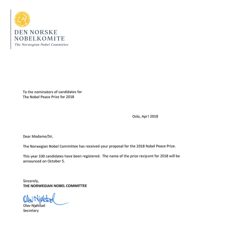 ノーベル平和賞オスロ委員会から