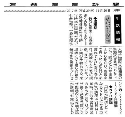 2017年11月22日 / 最終更新日時 : 2017年11月22日 kisokobe 収穫祭 告知 『石巻日日新聞』(2017年11月20日付) カレンダー カレンダーに追加 Timely カレンダーに追加 Google に追加 Outlook に追加 Apple カレンダーに追加 他のカレンダーに追加 XML ファイルとしてエクスポート 日時: 2017年11月20日 終日 2017-11-20T00:00:00+09:00 2017-11-21T00:00:00+09:00 EPSON MFP image FacebookXHatenaPocketCopy