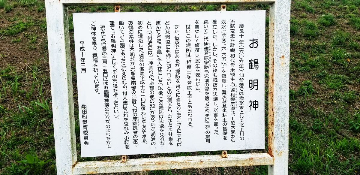 平安時代初期の坂上田村麻呂蝦夷遠征の時から,川は時に流域の家屋を舐め尽くしてきた。だから,人柱,つまり人身御供として,村の若い娘を犠牲に捧げたりした悲話も残っている。石巻市の北に登米(とめ)市中田(なかだ)町朝水の北上川沿いに,お鶴明神という祠がある。自然の災害と1946年まで住民は闘ってきた。追波川の名前の由来についても諸説あるようだ。川の水を飲むとおっぱいが出るようになるとか。アイヌ語であるらしいという説もある。たとえば,雄勝町に続く女川町(おながわちょう)の名前は,アイヌ語で「onne-nay 大きくなる川」だそうな。水害による悲劇は大和民族の容赦ないアイヌ侵略の怨霊としか思えない。そのように歴史に刻まれていると考える向きもあるだろう。