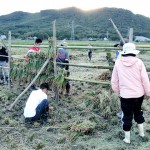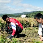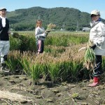 第18次[10月10-14日]は,稲刈りに従事。「田んぼアート」の30アールの天日干しにした。