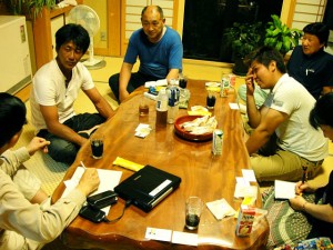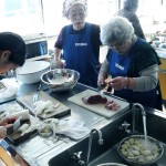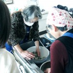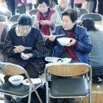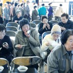 宮城県漁業協同組合丹野一雄のりを包んだ古代米のおにぎりの味はどうか,ボランティアは不安でいっぱいだった。固い,ねばっこさがない,甘くないと瑞穂の国では米の味に敏感だから,食後の感想を恐る恐る聴いてみた。すると皆さん,「おいしい」の連発。けっしておせじではなく,言われたのには,山本智也君,村上裕隆君,吉川 潤さんたちは感無量だったにちがいない。牡蠣汁も好評であった。中里事務局長の提案であった。つづいて,婦人会の調理の腕のきわめつけとして,鹿肉による汁ものだ。にんにくによって臭みをとるかどうか,尋ねられたので,代表として,むしろ臭いままで提供するようにお願いした。すると臭みなどなく,肉も柔らかく,豚汁では味わえない見事な高級料理になった。生まれてはじめて食する人たちも,思いがけない味にお代わりをすることになる。12時間の準備の成功の背景には,地元の女性たちの献身的な思いやりがこもっていたことは言うまでもない。