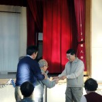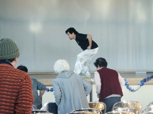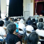 次に,神戸からのボランティアをいつも宿泊で受け入れている修空館の小野寺脩館長による「120歳の長寿をめざす体操」が導かれた。ユーモアいっぱいの指導に全員,年齢を忘れて笑い転げるように,鳥,猿,虎,熊,鹿になりきって固い体を動かす。皆さんは10歳は若返った顔をしていた。