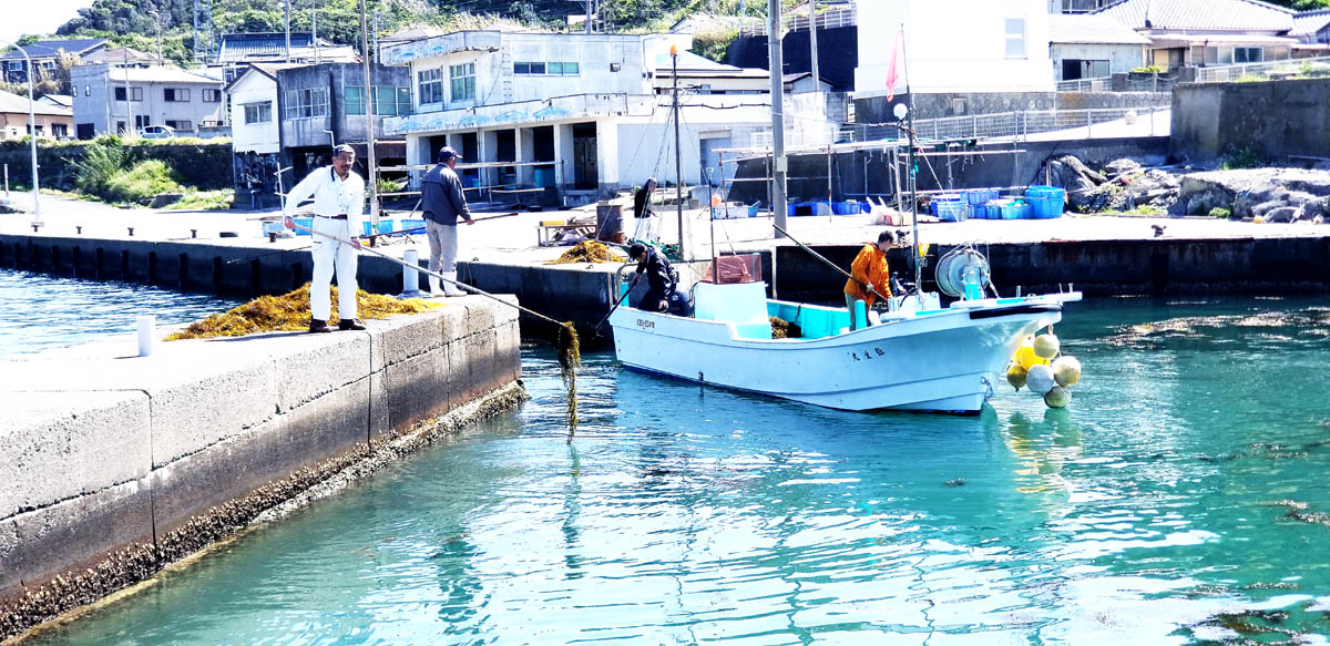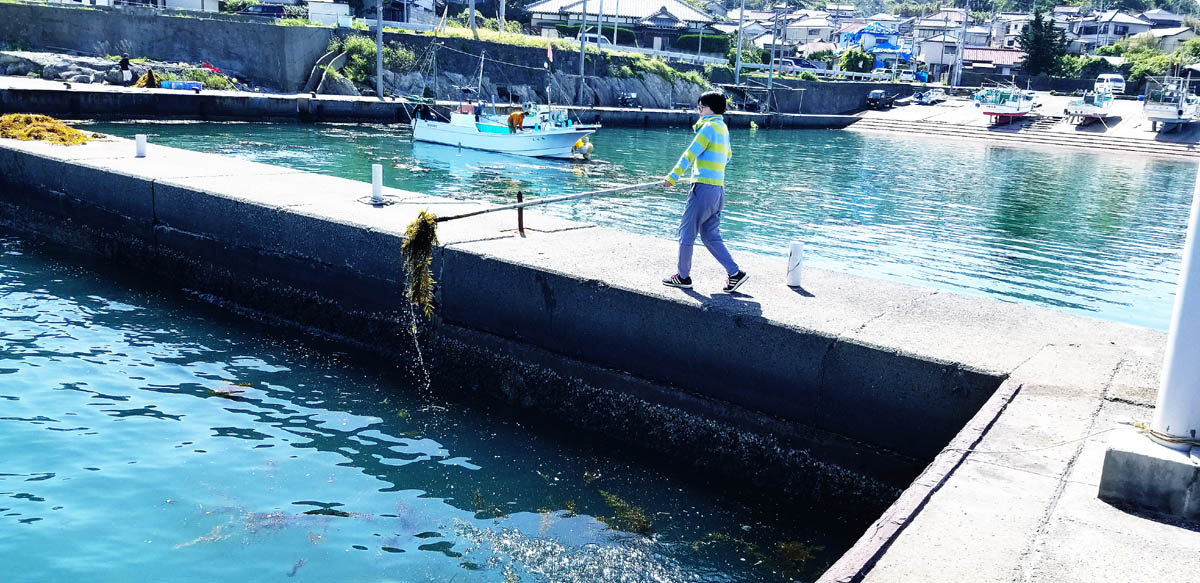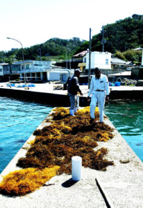 18日,今年になって最大の激しい風。風速20メートルのため,漁師さんたちにとり海面下のナガモクと言っているホンダワラ,アカモクなどが港を覆っていました。スクリューにからむので撤去作業です。
