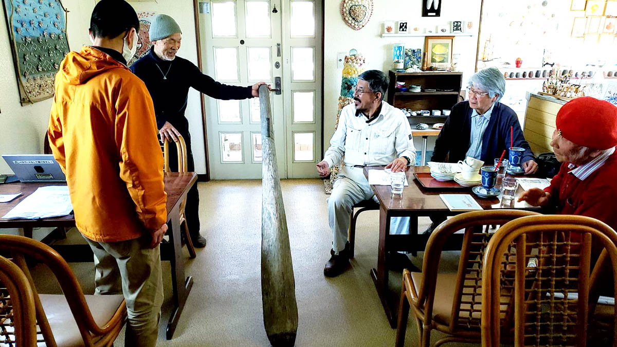 カメラマン新井克英氏,元TBSディレクター鈴木薫氏(手前赤ベレー帽)と面談。押送船(おしょくりぶね)の話題から櫓(ろ)の制作技術などの会話をしていると新堀隆義氏が本物の櫓を持ってこられた場面。